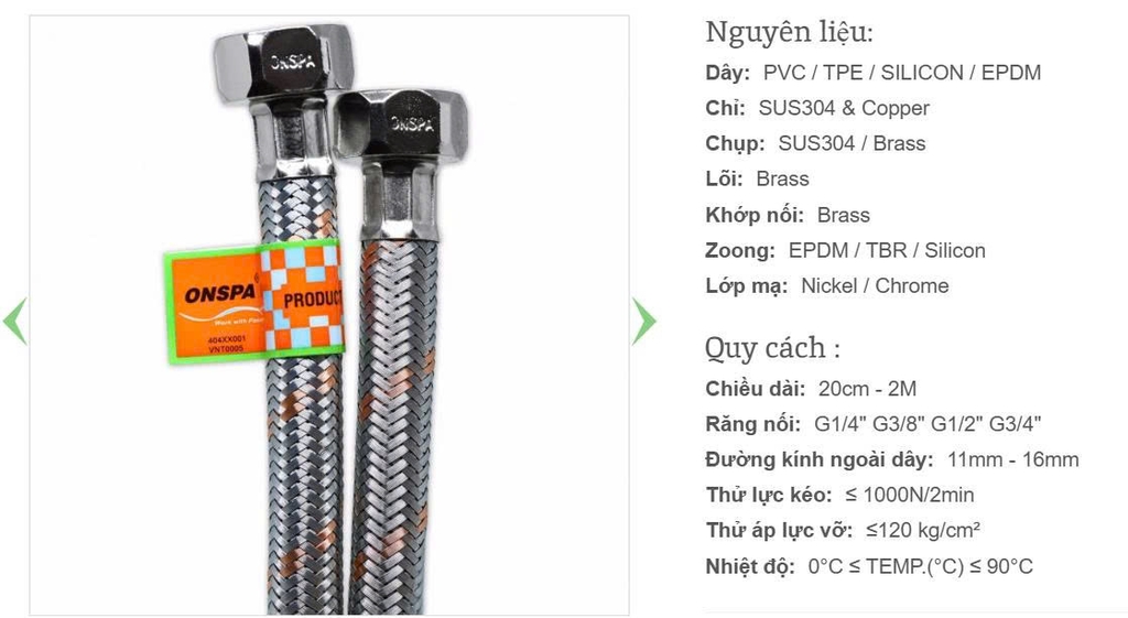 Dây cấp nước sọc inox 304 Onspa thích hợp sử dụng cho hệ thống cấp nước bồn lavabo, bồn cầu, bình nóng lạnh, máy giặt, máy lọc nước... đảm bảo dòng nước sạch, ổn định và an toàn.