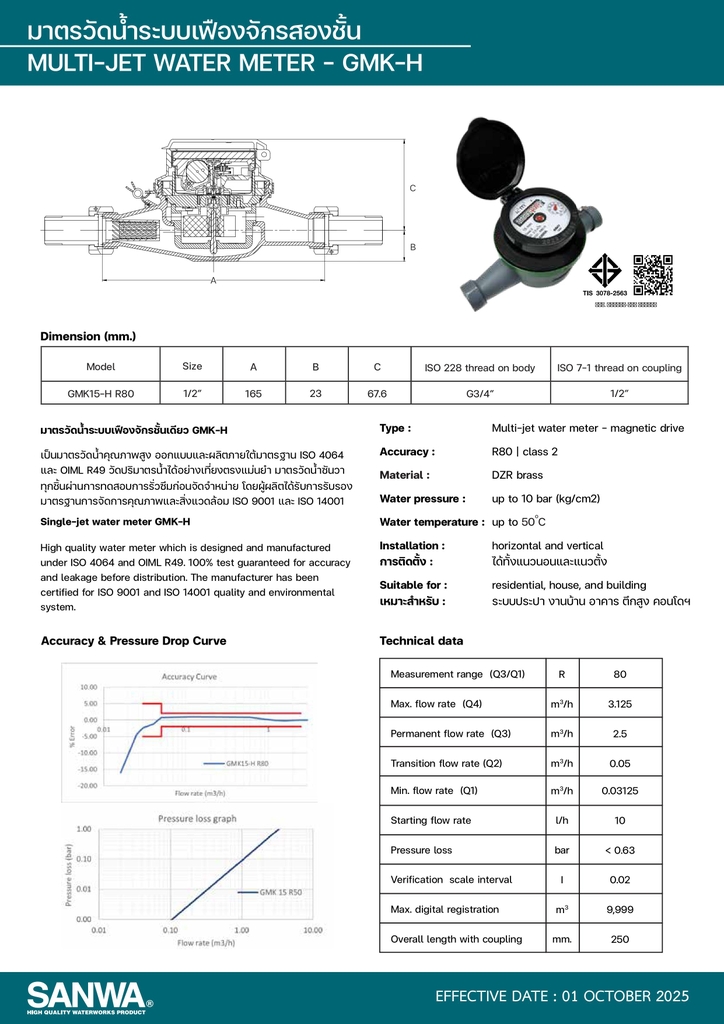Đồng hồ nước SANWA GMK 15-ID là thiết bị đo lưu lượng nước cao cấp, ứng dụng công nghệ đa tia (Multi-Jet) kết hợp truyền động từ (magnetic drive), mang lại độ chính xác cao, hoạt động ổn định và bền bỉ theo thời gian. Sản phẩm phù hợp cho hệ thống cấp nước dân dụng, nhà ở, tòa nhà và chung cư.