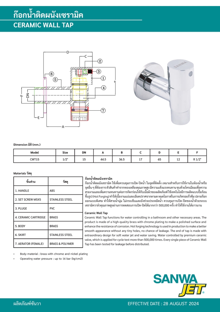 Vòi Ceramic SANWA JET 1/2″ là dòng vòi nước cao cấp được sản xuất từ đồng nguyên chất, ứng dụng công nghệ hiện đại giúp tăng độ bền, chống ăn mòn và đảm bảo khả năng vận hành ổn định lâu dài. Sản phẩm phù hợp cho hệ thống cấp nước gia đình, nhà máy, tưới tiêu và công trình.